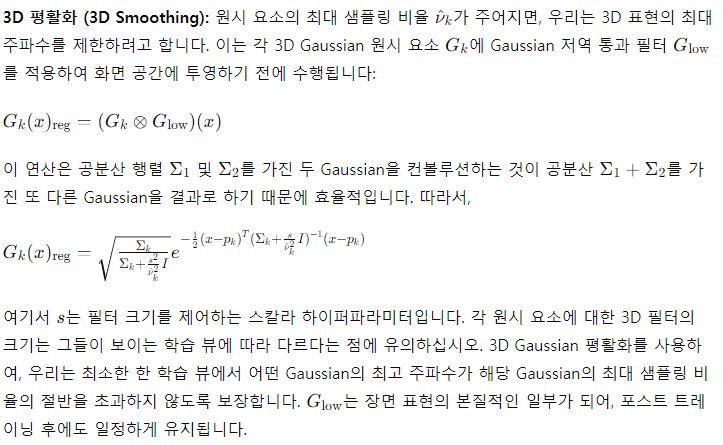 - 3DGS의 3D Gaussian 원시 요소의 최대 주파수를 효과적으로 정규화하는 3D 평활화 필터를 도입하여 이전 방법 [18, 59]에서 관찰된 분포 외 렌더링의 왜곡을 해결했습니다.
