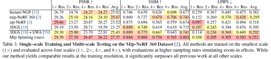 표 3. Mip-NeRF 360 데이터셋 [2]에서 단일 스케일 학습 및 다중 스케일 테스트 모든 방법은 가장 작은 스케일(1×)에서 학습되고 네 가지 스케일(1×, 2×, 4×, 8×)에서 평가되어 높은 샘플링 비율에서 줌 인 효과를 모방합니다. 우리의 방법은 학습 해상도에서 유사한 결과를 나타내지만, 다른 모든 스케일에서 이전 작업을 크게 능가합니다.