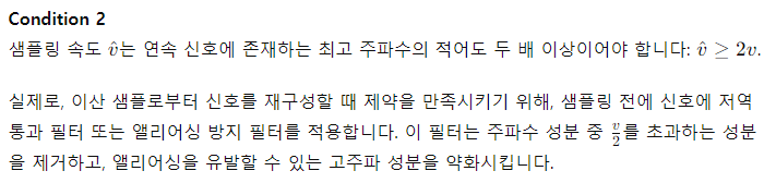 - 샘플링된 데이터는 앨리어싱 없이 신호를 재구성할 수 있는 충분한 정보를 포함해야 합니다.