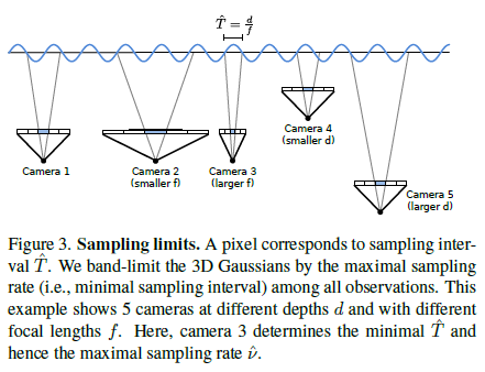 5.1. 3D 평활화 필터 다중 뷰 관찰로부터 3D 방사 필드를 재구성하는 것은 잘 알려진 비정형 문제로, 서로 다른 여러 재구성이 동일한 2D 투영을 초래할 수 있습니다 [2, 55, 56]. 우리의 주요 통찰력은 재구성된 3D 장면의 최고 주파수가 학습 뷰에 의해 정의된 샘플링 비율에 의해 제한된다는 것입니다. 나이퀴스트 정리 3.1에 따라, 우리는 최적화 동안 3D 표현의 최대 주파수를 제한하는 것을 목표로 합니다.