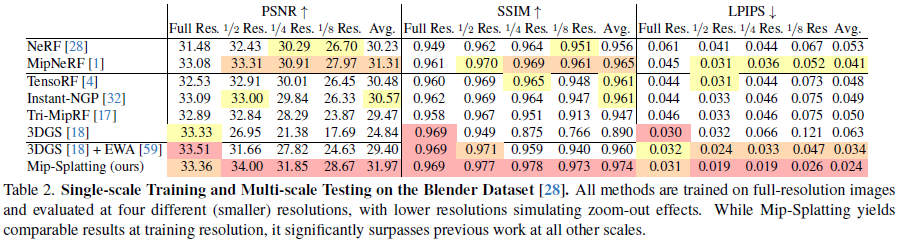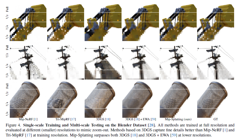 표 2. Blender 데이터셋 [28]에서 단일 스케일 학습 및 다중 스케일 테스트. 모든 방법은 전체 해상도 이미지에서 학습되고, 네 가지 다른(더 작은) 해상도에서 평가되어 줌 아웃 효과를 모방합니다. Mip-Splatting은 학습 해상도에서 유사한 결과를 나타내지만, 다른 모든 스케일에서 이전 작업을 크게 능가합니다.