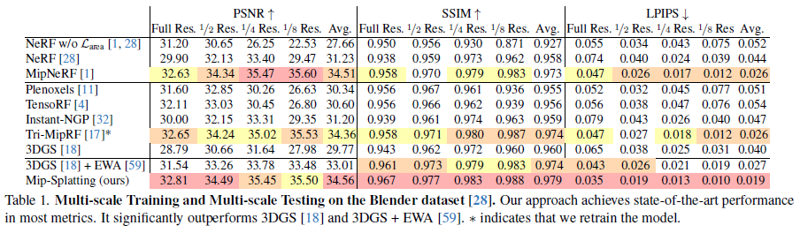 표 1. Blender 데이터셋 [28]에서 다중 스케일 학습 및 다중 스케일 테스트. 우리의 접근법은 대부분의 지표에서 최신 성능을 달성합니다. 이는 3DGS [18] 및 3DGS + EWA [59]를 크게 능가합니다. ∗는 우리가 모델을 재학습했음을 나타냅니다.