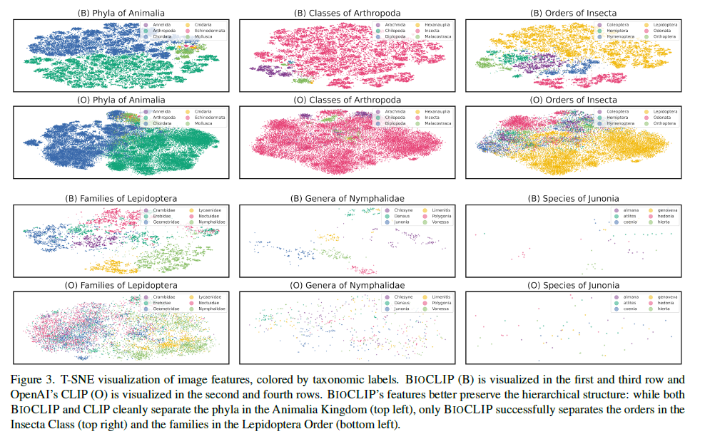 그림 3. 분류학적 레이블별로 색상이 지정된 이미지 특징의 T-SNE 시각화. BIOCLIP (B)은 첫 번째 및 세 번째 행에 시각화되고 OpenAI의 CLIP (O)는 두 번째 및 네 번째 행에 시각화됩니다. BIOCLIP의 기능은 계층적 구조를 더 잘 보존합니다. BIOCLIP과 CLIP 모두 Animalia Kingdom(왼쪽 상단)의 문을 깔끔하게 분리하지만 BIOCLIP만 Insecta Class(오른쪽 상단) 및 Lepidoptera Order(왼쪽 하단)의 주문을 성공적으로 분리합니다.