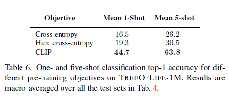 표 6. TREEOFLIFE-1M에 대한 다양한 사전 교육 목표에 대한 1샷 및 5샷 분류 상위 1 정확도. 결과는 표 4의 모든 테스트 세트에 대해 매크로 평균됩니다.