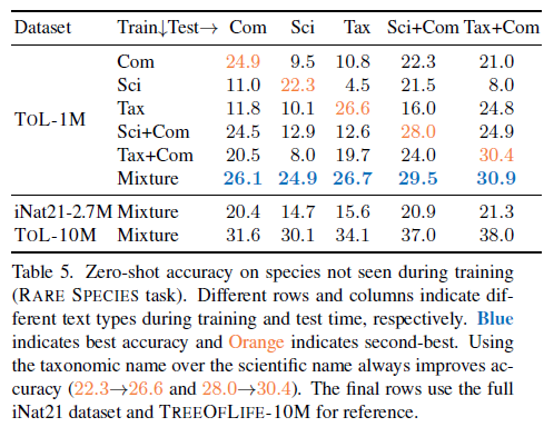 표 5. 훈련 중에 보이지 않는 종에 대한 제로샷 정확도 (RARE SPECIES 작업). 다른 행과 열은 각각 훈련 및 테스트 시간 동안 다른 텍스트 유형을 나타냅니다. 파란색은 최고의 정확도를 나타내고 주황색은 두 번째로 좋은 정확도를 나타냅니다. 학명보다 분류학적 이름을 사용하면 항상 정확도가 향상됩니다(22.3!26.6 및 28.0!30.4). 마지막 행은 참조용으로 전체 iNat21 데이터 세트 및 TREEOFLIFE-10M을 사용합니다.