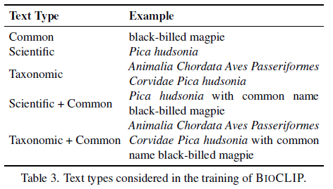 표 3. BIOCLIP 교육에서 고려되는 텍스트 유형.