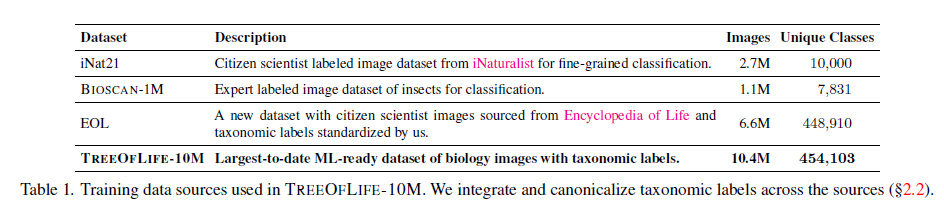 표 1. TREEOFLIFE-10M에 사용된 교육 데이터 소스. 소스 간에 분류 레이블을 통합하고 표준화합니다(§2.2).