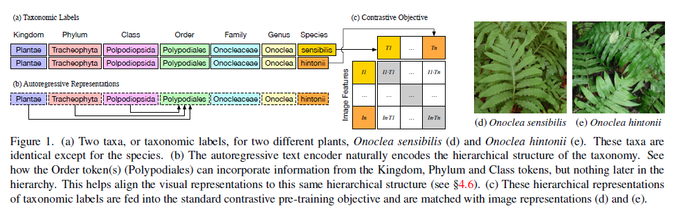그림 1. (a) 두 가지 식물, Onoclea sensibilis (d) 및 Onoclea hintonii (e)에 대한 두 가지 분류군 또는 분류 레이블. 이러한 분류군은 종을 제외하고는 동일합니다. (b) 자기 회귀 텍스트 인코더는 자연스럽게 분류 체계의 계층 구조를 인코딩합니다. Order 토큰(Polypodiales)이 Kingdom, Phylum 및 Class 토큰의 정보를 통합할 수 있지만 계층 구조의 후반부에는 아무것도 통합할 수 없는 방법을 확인하십시오. 이렇게 하면 시각적 표현을 동일한 계층적 구조에 맞출 수 있습니다(§4.6 참조). (c) 이러한 분류 레이블의 계층적 표현은 표준 대조 사전 훈련 목표에 입력되고 이미지 표현과 일치합니다(d 및 e).