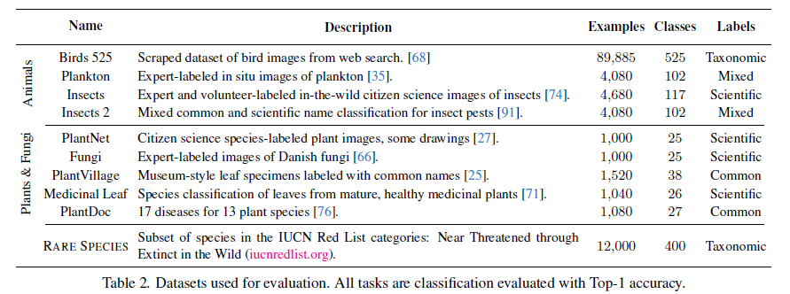 Meta-Album[84], Birds 525[68] 및 새로운 RARE SPECIES 작업(§4.2에 설명됨)의 8가지 생물학적으로 관련된 작업인 10가지 분류 작업에 대해 평가합니다. Meta-Album은 다양한 주제를 포괄하는 메타 학습을 위한 데이터 세트 모음입니다. 구체적으로 Plankton, Insects, Insects 2, PlantNet, Fungi, PlantVillage, Medicinal Leaf 및 PlantDoc 데이터 세트를 사용합니다. 분류 작업은 생명 나무의 4개의 다세포 왕국(동물, 식물, 균류 및 원생생물)을 모두 포괄하며 다양한 이미지 분포(사진, 현미경 이미지, 그림 및 박물관 표본)를 가집니다. 표 2는 데이터 세트를 요약합니다. 전체 분류학적 이름부터 과학적 이름 또는 일반 이름만 포함하는 다양한 레이블 유형으로 구성됩니다.