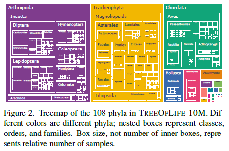 그림 2. TREEOFLIFE-10M의 108개 문의 트리맵. 서로 다른 색상은 서로 다른 문을 나타냅니다. 중첩된 상자는 클래스, 주문 및 가족을 나타냅니다. 내부 상자의 수가 아니라 상자 크기는 상대적인 샘플 수를 나타냅니다.