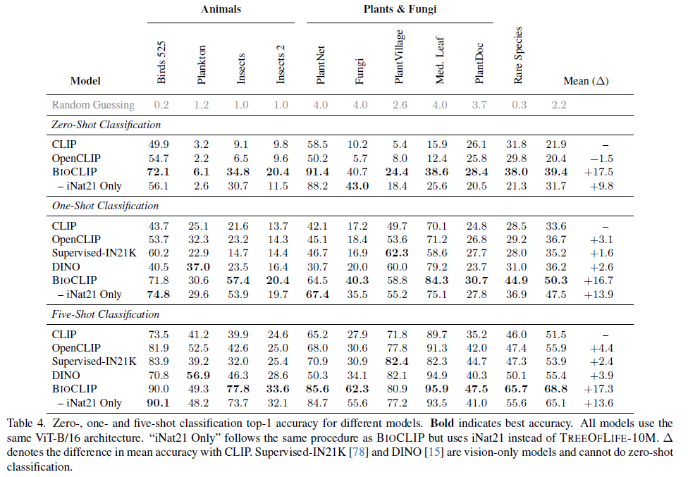 표 4. 서로 다른 모델에 대한 0, 1 및 5 shot 분류 상위 1 정확도. 굵게 표시된 것은 최고의 정확도를 나타냅니다. 모든 모델은 동일한 ViT-B/16 아키텍처를 사용합니다. "iNat21 Only"는 BIOCLIP과 동일한 절차를 따르지만 TREEOFLIFE-10M 대신 iNat21을 사용합니다.