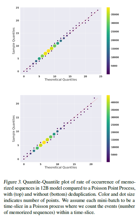 12B 모델에서 암기된 시퀀스 발생률을 포아송 점 과정과 비교한 Q-Q 플롯, 중복 제거 여부를 기준으로 위(중복 제거)와 아래(중복 제거 안함)에 표시됩니다. 색상과 점 크기는 점의 수를 나타냅니다. 우리는 각 미니배치를 포아송 과정의 시간 단위로 간주하고, 해당 시간 단위 내에서 사건(암기된 시퀀스 수)을 셉니다.