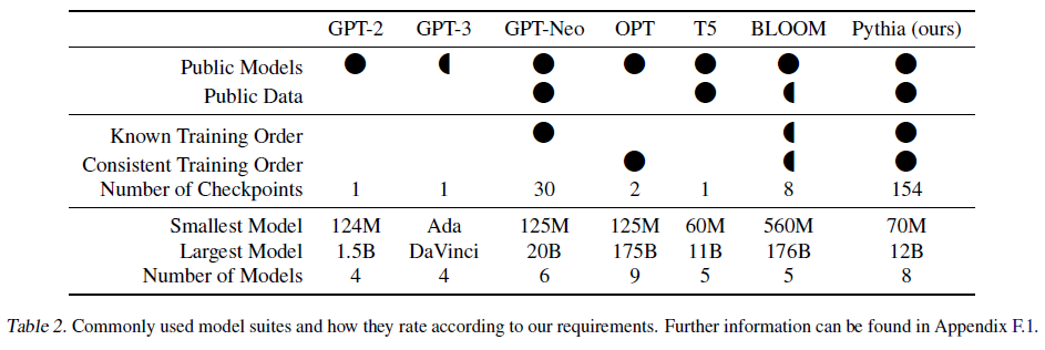 표 2는 이러한 기준에 따라 여러 인기 있는 언어 모델 모음에 대한 평가를 제공합니다. "체크포인트 수"에 대해서는 체크포인트가 가장 적은 모델 모음을 기준으로 평가했습니다. 일부 모델 모음(GPT-Neo, OPT, BLOOM 등)은 더 많은 체크포인트를 가지고 있는 하위 집합이 있지만, 대부분의 연구 목적에는 충분하지 않습니다. 특히, 일반적으로 더 작은 모델이 더 많은 체크포인트를 가지는 경우가 많아 이러한 문제가 심화됩니다. 위 목록에서 가장 큰 모델이 더 작은 모델보다 더 많은 체크포인트를 가진 유일한 모델 모음은 GPT-Neo입니다.