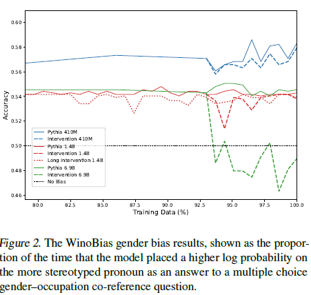 WinoBias 구현에 대해(부록 C.1 참조), 그림 2에서 개입의 명확한 효과를 볼 수 있습니다: 각 개입과 모델 규모 전반에 걸쳐 고정 관념적 정확성이 감소합니다. 테스트된 가장 큰 모델인 6.9B에서, 개입을 적용한 결과 모델이 훈련 전반에서 고정 관념적 편향에서 반(反)고정 관념적 편향으로 성공적으로 변화했습니다. 이러한 결과는 더 큰 용량의 모델이 직업과 대명사 사이의 더 복잡한 관계를 학습할 수 있는 능력 덕분에 고정 관념적 편향을 덜 보인다는 것을 나타내며, 유사한 이유로 개입 효과 크기가 규모에 따라 증가한다고 가정합니다.