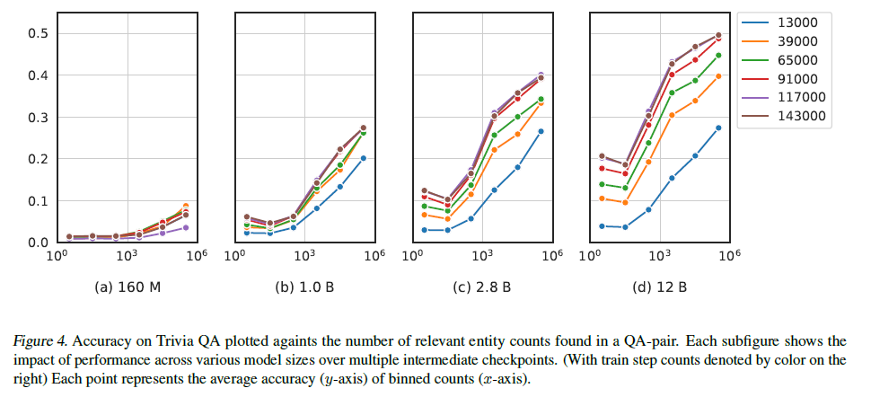 QA 쌍에서 발견된 관련 엔티티 수와 비교하여 플롯된 Trivia QA 정확도입니다. 각 서브피겨는 다양한 모델 크기에서 여러 중간 체크포인트에 걸친 성능의 영향을 보여줍니다(오른쪽 색상으로 표시된 훈련 단계 수). 각 점은 구간별 빈도의 평균 정확도(y축)를 나타냅니다(x축).
