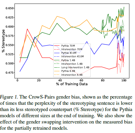 언어 모델이 훈련 데이터에 내재된 편향을 어떻게 반영하는지에 대해 많은 연구가 있습니다. 그러나 일부 연구는 언어 모델의 편향에 대한 미세 조정의 영향을 탐구했거나 (Gira et al., 2022; Kirtane et al., 2022; Choenni et al., 2021), 코퍼스 통계와 측정된 편향 간의 관계를 조사했습니다 (Bordia & Bowman, 2019; Van der Wal et al., 2022b). 연구자들은 일반적으로 다른 크기의 대형 언어 모델에서 훈련 데이터가 편향 학습 동역학에 미치는 역할을 연구할 도구가 부족했습니다. Pythia를 통해 이제 가능한 것을 보여주기 위해, 우리는 언어 모델의 사전 훈련 데이터에서 성별 용어의 빈도를 의도적으로 수정하는 것이 모델의 다운스트림 행동과 편향에 영향을 미칠 수 있는지를 분석합니다. 우리는 모델 모음의 알려진 사전 훈련 데이터와 공개 훈련 코드베이스를 활용하여 모델 훈련의 마지막 7% 및 21% 동안 대명사의 대부분을 남성형이 아닌 여성형으로 수정하여 역으로 훈련합니다. 이러한 개입이 목표 벤치마크에서 편향 측정을 줄이는 데 성공적임을 입증하고, 향후 모델 행동에 훈련 코퍼스가 미치는 영향을 연구하기 위한 주요 도구로서 반사실적 개입과 모델 부분의 재훈련 가능성을 제안합니다.
