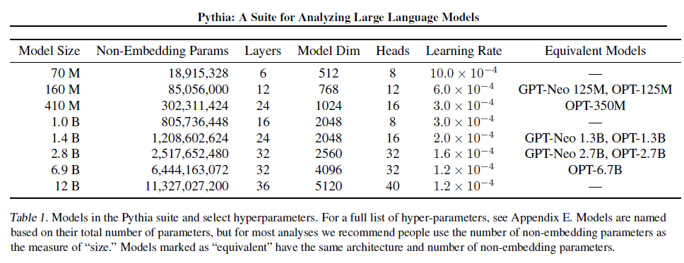 표 1. Pythia 모음의 모델 및 선택된 하이퍼파라미터. 하이퍼파라미터의 전체 목록은 부록 E를 참조하십시오. 모델은 총 파라미터 수를 기준으로 이름이 지정되었지만, 대부분의 분석에서는 비임베딩 파라미터 수를 "크기"의 척도로 사용할 것을 권장합니다. "동등"으로 표시된 모델은 동일한 아키텍처와 비임베딩 파라미터 수를 가집니다..