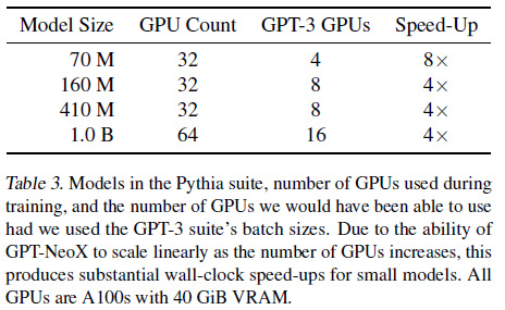 표 3. Pythia 모음의 모델, 훈련 중 사용된 GPU 수 및 GPT-3 모음의 배치 크기를 사용했을 때 사용할 수 있었던 GPU 수를 나타냅니다. GPU 수가 증가함에 따라 GPT-NeoX가 선형적으로 확장할 수 있는 능력 덕분에, 이는 작은 모델에 대해 상당한 벽시계 시간 단축을 제공합니다. 모든 GPU는 40 GiB VRAM을 가진 A100입니다.