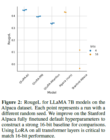 알파카 데이터셋에서 LLaMA 7B 모델의 RougeL 점수. 각 점은 다른 랜덤 시드를 사용한 실행을 나타냅니다. 16비트 성능을 맞추기 위해 모든 트랜스포머 레이어에서 LoRA를 사용하는 것이 중요합니다. Stanford Alpaca의 전체 미세 조정 기본 하이퍼파라미터를 개선하여 강력한 16비트 기준을 구성합니다.