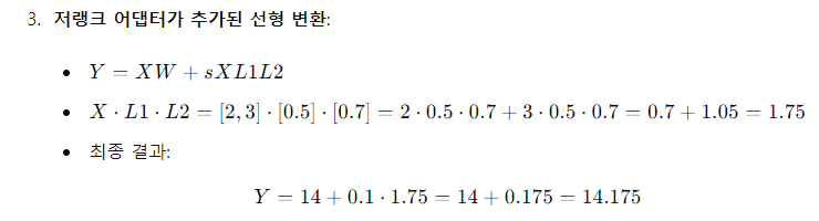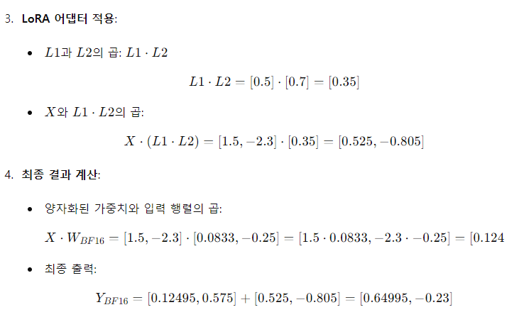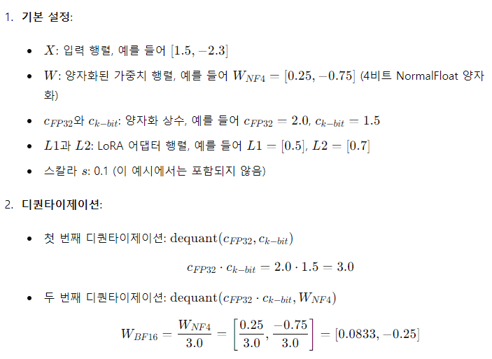 위에서 설명한 구성 요소를 사용하여, 단일 LoRA 어댑터를 사용하는 양자화된 기본 모델의 단일 선형 계층에 대해 QLORA를 다음과 같이 정의합니다: