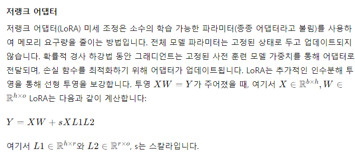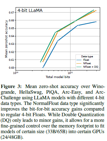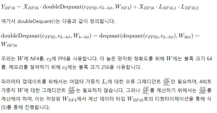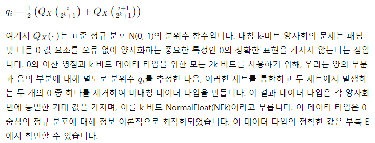 - 4비트 NormalFloat: 보통 분포된 데이터에 대해 정보 이론적으로 최적화된 양자화 데이터 타입으로, 4비트 정수와 4비트 플로트보다 더 나은 경험적 결과를 제공합니다.