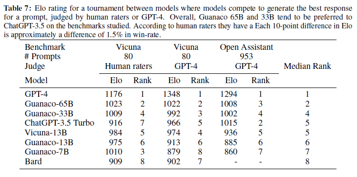 전반적으로, Guanaco 65B와 33B 모델은 연구된 벤치마크에서 ChatGPT-3.5보다 선호되는 경향이 있습니다. 인간 평가자에 따르면, Elo의 10점 차이는 승률에서 약 1.5%의 차이를 나타냅니다.