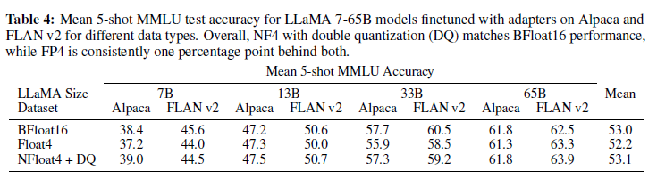 전반적으로, 이중 양자화(DQ)를 사용한 NF4는 BFloat16 성능과 일치하며, FP4는 일관되게 1% 포인트 뒤처집니다.
