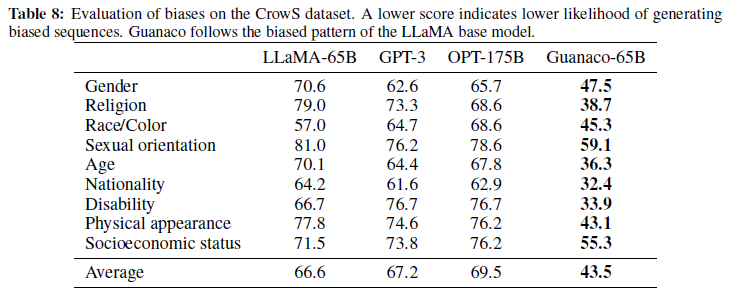 우리가 일반적인 챗봇 성능에 대한 상세한 평가를 제공하는 동안, 또 다른 한계는 Guanaco의 책임 있는 AI 평가를 제한적으로 수행한 것입니다. 우리는 표 8에서 다른 모델과 비교하여 Guanaco-65B가 사회적 편향 시퀀스를 생성할 가능성을 평가했습니다. Guanaco-65B의 평균 점수는 다른 원시 사전 훈련 모델보다 훨씬 낮았습니다. 따라서 OASST1 데이터셋에서의 미세 조정이 LLaMA 기본 모델의 편향을 줄이는 것처럼 보입니다. 이러한 결과는 고무적이지만, Guanaco가 다른 유형의 편향에 대해서도 잘하는지는 불확실합니다. Guanaco 및 유사한 챗봇에서 편향을 분석하는 추가 평가는 미래 연구에 맡깁니다.