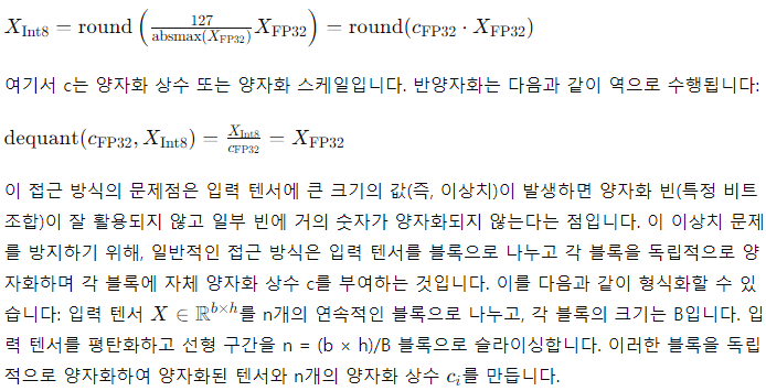 양자화는 더 많은 정보를 담고 있는 표현에서 더 적은 정보를 담고 있는 표현으로 입력을 이산화하는 과정입니다. 이는 종종 더 많은 비트를 사용하는 데이터 타입을 더 적은 비트로 변환하는 것을 의미하며, 예를 들어 32비트 플로트에서 8비트 정수로 변환하는 것을 말합니다. 저비트 데이터 타입의 전체 범위를 사용하도록 보장하기 위해, 입력 데이터 타입은 일반적으로 입력 요소의 절대 최대값으로 정규화하여 목표 데이터 타입 범위로 재조정됩니다. 예를 들어, 32비트 부동 소수점(FP32) 텐서를 범위 [−127, 127]의 Int8 텐서로 양자화하는 경우:
