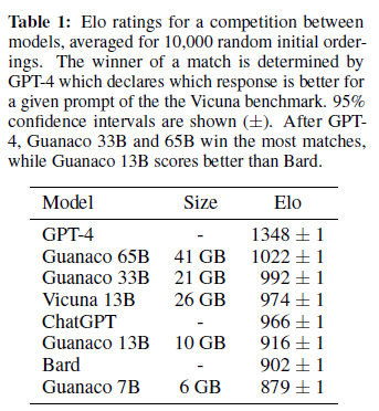 모델 간 경쟁의 Elo 등급은 10,000개의 무작위 초기 순서를 평균낸 것입니다. Vicuna 벤치마크의 특정 프롬프트에 대한 응답이 더 나은지를 결정하는 GPT-4에 의해 매치의 승자가 결정됩니다. 95% 신뢰 구간이 표시되어 있습니다(±). GPT-4 다음으로 Guanaco 33B와 65B가 가장 많은 매치에서 승리했으며, Guanaco 13B는 Bard보다 높은 점수를 기록했습니다.