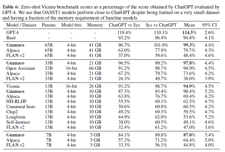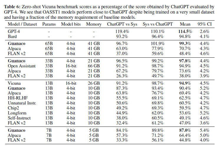 Vicuna 벤치마크에서 ChatGPT와의 상대적인 결과는 표 6에 나와 있습니다. 우리는 Guanaco 65B가 GPT-4 이후 가장 성능이 좋은 모델이며, ChatGPT에 비해 99.3%의 성능을 달성함을 발견했습니다. Guanaco 33B는 Vicuna 13B 모델보다 더 많은 파라미터를 가지고 있지만, 가중치에 4비트 정밀도만 사용하여 메모리 효율이 더 높습니다(21GB 대 26GB)며, Vicuna 13B에 비해 3% 포인트의 성능 향상을 제공합니다. 또한, Guanaco 7B는 현대 스마트폰에 쉽게 적합하며(5GB 메모리) 여전히 Alpaca 13B보다 거의 20% 포인트 높은 점수를 기록합니다.