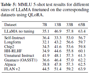 표 5: QLoRA를 사용하여 해당 데이터 세트에서 미세 조정된 다양한 크기의 LLaMA에 대한 MMLU 5샷 테스트 결과.