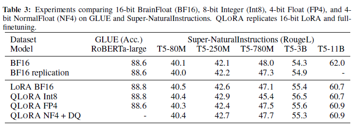 표 3: GLUE 및 Super-NaturalInstructions에서 16비트 BrainFloat(BF16), 8비트 Integer(Int8), 4비트 Float(FP4), 4비트 NormalFloat(NF4)를 비교한 실험