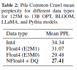4비트 NormalFloat(NF4) 데이터 타입은 정보 이론적으로 최적화되어 있지만, 이 속성이 경험적 이점으로 번역되는지 여부는 여전히 결정해야 합니다. 우리는 Dettmers와 Zettlemoyer의 설정을 따르며, 다양한 크기(125M에서 65B)의 양자화된 LLM(OPT, BLOOM, Pythia, LLaMA)을 다양한 데이터 타입으로 평가합니다. 그림 3과 표 2에서 NF4가 FP4와 Int4보다 성능을 크게 개선하며, 이중 양자화가 성능 저하 없이 메모리 사용량을 줄인다는 것을 알 수 있습니다.