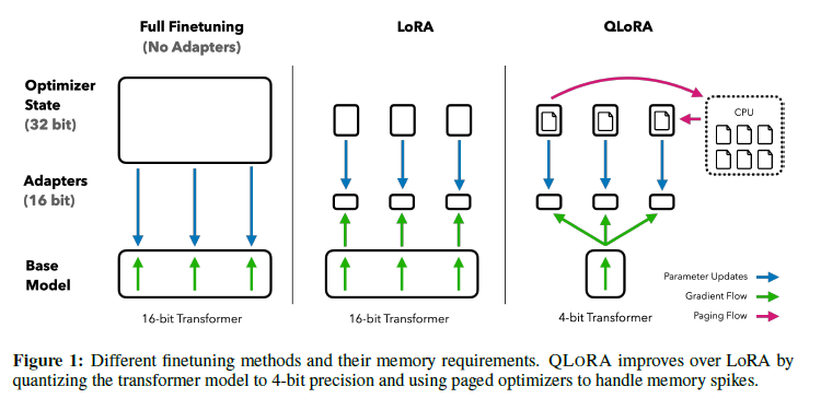QLORA는 트랜스포머 모델을 4비트 정밀도로 양자화하고 메모리 스파이크를 처리하기 위해 페이지드 옵티마이저를 사용하여 LoRA보다 향상된 성능을 제공합니다.