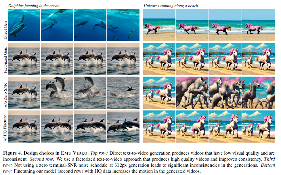 Figure 4. EMU VIDEO의 설계 선택. 상단 행: 직접 텍스트-비디오 생성은 낮은 시각적 품질과 일관성 문제를 가집니다. 두 번째 행: 분할 텍스트-비디오 접근 방식은 높은 품질의 비디오를 생성하고 일관성을 개선합니다. 세 번째 행: 512px 생성에서 제로 최종-SNR 노이즈 스케줄을 사용하지 않으면 생성의 일관성에 큰 문제가 발생합니다. 하단 행: HQ 데이터로 모델(두 번째 행)을 미세 조정하면 생성된 비디오의 모션이 증가합니다.