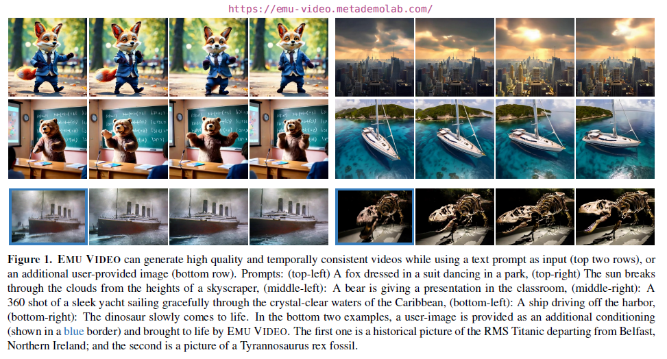 그림 1. EMU VIDEO는 텍스트 프롬프트를 입력으로 사용하여 고품질 및 시간적 일관성을 가진 비디오를 생성할 수 있습니다(상위 두 줄), 또는 추가적인 사용자 제공 이미지를 사용합니다(하단 줄). 프롬프트: (좌측 상단) 공원에서 정장을 입고 춤추는 여우, (우측 상단) 고층 건물의 높이에서 구름 사이로 해가 비추는 장면, (좌측 중간) 교실에서 발표하는 곰, (우측 중간) 카리브해의 맑은 물 위를 우아하게 항해하는 세련된 요트의 360도 샷, (좌측 하단) 항구를 떠나는 배, (우측 하단) 천천히 생명을 얻는 공룡. 하단 두 예시에서는 사용자 이미지가 추가적인 조건으로 제공되며(파란색 테두리로 표시됨) EMU VIDEO에 의해 생명을 얻습니다. 첫 번째는 RMS 타이타닉이 북아일랜드 벨파스트에서 출항하는 역사적인 사진이며, 두 번째는 티라노사우루스 렉스 화석 사진입니다.