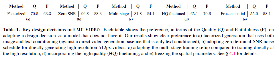 Table 1. EMU VIDEO의 주요 설계 결정. 각 표는 품질(Q)과 충실도(F) 측면에서 설계 결정을 채택한 경우와 그렇지 않은 모델의 선호도를 보여줍니다. 우리의 결과는 a) 이미지 및 텍스트 조건을 사용하는 분할 생성이 텍스트 조건만 사용하는 직접 비디오 생성 기본 모델에 비해 선호됨을, b) 높은 해상도 512px 비디오를 직접 생성하기 위한 제로 최종-SNR 노이즈 스케줄 채택이 선호됨을, c) 높은 해상도에서 직접 훈련하는 것과 비교하여 다단계 훈련 설정 채택이 선호됨을, d) 고품질 미세 조정 도입이 선호됨을, e) 공간 매개변수를 고정하는 것이 선호됨을 보여줍니다. 자세한 내용은 § 4.1을 참조하십시오.