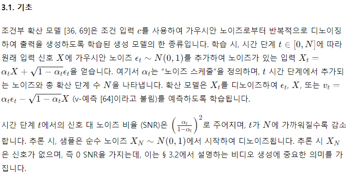 우리는 이전 연구 [17, 62]에서 사용된 확산 노이즈 스케줄이 학습-테스트 불일치를 가져와 고품질 비디오 생성을 방해함을 발견했습니다([12, 51]에 보고됨). 학습 시 노이즈 스케줄은 약간의 잔여 신호를 남기며, 즉 최종 확산 시간 단계 N에서도 신호 대 잡음비 (SNR)가 0이 아닙니다. 이는 실제 데이터에 대한 신호가 없는 임의의 가우시안 노이즈로부터 샘플링할 때 확산 모델이 테스트 시 일반화하는 것을 방해합니다. 잔여 신호는 공간과 시간 전반에 걸쳐 중복된 픽셀로 인해 고해상도 비디오 프레임에서 더 높습니다. 우리는 노이즈 스케줄을 조정하고 최종 α_N=0으로 설정하여 이 문제를 해결합니다 [51]. 이는 학습 시 최종 시간 단계 N에서도 0 SNR을 가지게 합니다. 우리는 이 설계 결정이 고해상도 비디오 생성에 중요함을 발견했습니다.