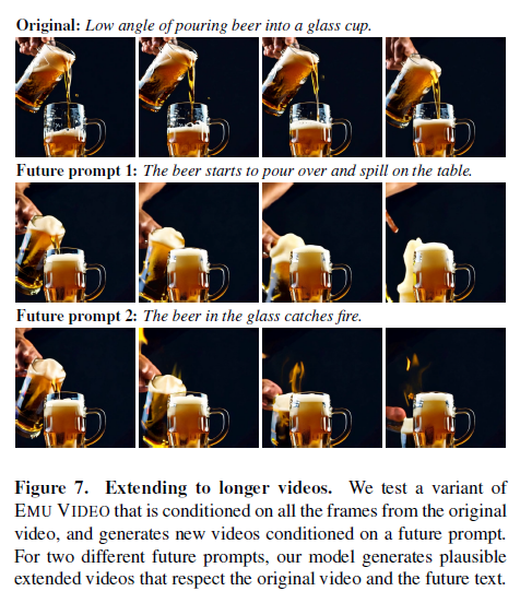 더 긴 텍스트로 비디오 길이 확장. 우리의 모델은 텍스트 프롬프트와 시작 프레임을 조건으로 비디오를 생성합니다. 작은 아키텍처 수정으로 모델을 T 프레임을 조건으로 하여 비디오를 확장할 수 있습니다. 따라서, 우리는 과거 16프레임을 조건으로 미래 16프레임을 생성하는 EMU VIDEO의 변형을 훈련합니다. 비디오를 확장할 때, 우리는 원래 비디오에 사용된 것과 다른 미래 텍스트 프롬프트를 사용하고 Figure 7에서 결과를 시각화합니다. 우리는 확장된 비디오가 원래 비디오와 미래 텍스트 프롬프트를 모두 존중함을 발견했습니다.