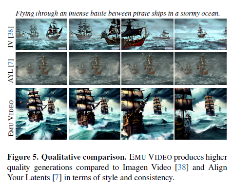 Figure 5. 정성적 비교. EMU VIDEO는 스타일과 일관성 측면에서 Imagen Video [38]와 Align Your Latents [7]보다 더 높은 품질의 생성을 제공합니다.
