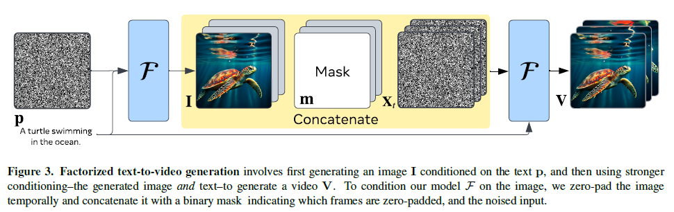 그림 3. 분할 텍스트-비디오 생성은 텍스트 조건 p로 이미지를 생성하고, 더 강력한 조건 - 생성된 이미지와 텍스트 - 을 사용하여 비디오 V를 생성합니다. 우리 모델 F를 이미지 조건으로 만들기 위해, 우리는 이미지를 시간적으로 제로 패딩하고, 어떤 프레임이 제로 패딩되었는지 표시하는 이진 마스크와 노이즈 입력을 연결합니다.
