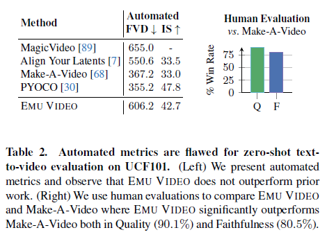 Table 2. UCF101에서 제로 샷 텍스트-비디오 평가를 위한 자동화된 메트릭은 결함이 있습니다. (왼쪽) 우리는 자동화된 메트릭을 제시하며, EMU VIDEO가 이전 작업을 능가하지 못함을 관찰합니다. (오른쪽) 우리는 EMU VIDEO와 Make-A-Video를 비교하는 인간 평가를 사용하며, 여기서 EMU VIDEO는 품질(90.1%)과 충실도(80.5%)에서 Make-A-Video를 크게 능가합니다.