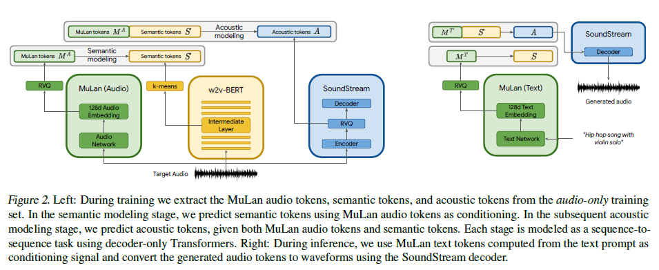 - 오른쪽: 추론 중에는 텍스트 프롬프트로부터 계산된 MuLan 텍스트 토큰을 조건 신호로 사용하고, 생성된 오디오 토큰을 SoundStream 디코더를 사용하여 파형으로 변환합니다.