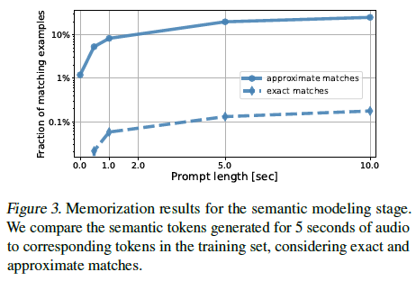 그림 3. 의미적 모델링 단계의 암기 결과. 우리는 5초 오디오에 대해 생성된 의미 토큰을 훈련 세트의 해당 토큰과 비교하여 정확 일치와 근사 일치를 고려합니다.
