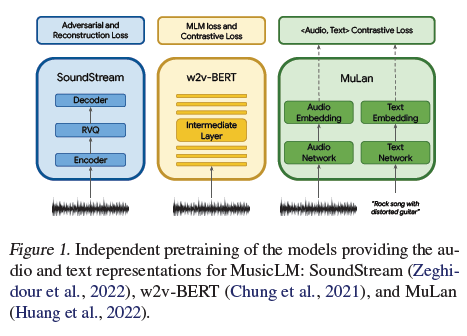 그림 1. MusicLM의 오디오 및 텍스트 표현을 제공하는 모델들의 독립적인 사전 훈련: SoundStream(Zeghidour et al., 2022), w2v-BERT(Chung et al., 2021), MuLan(Huang et al., 2022).