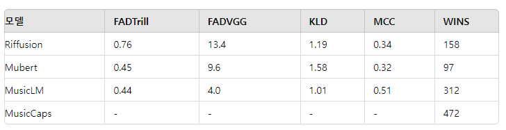 이 표는 MusicLM이 다른 모델들보다 우수한 성능을 보임을 명확히 보여줍니다.