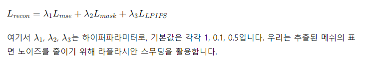 MSE 손실 외에도, 우리는 재구성 외형을 감독하기 위해 마스크 손실과 LPIPS 손실도 포함합니다. 재구성 모델이 입력된 네 뷰 이미지 내의 빈 공간을 구별할 수 있도록 도와주기 위해, 우리는 진실된 알파 마스크와 렌더링된 알파 마스크 간의 이진 교차 엔트로피 손실을 마스크 손실로 채택합니다. LPIPS 손실은 입력 이미지로부터 인지적 정보를 추출하는 데 사용됩니다. 훈련 목표는 식 4에 나와 있습니다.