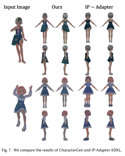그림 7: CharacterGen과 IP-Adapter-SDXL의 결과를 비교합니다.
