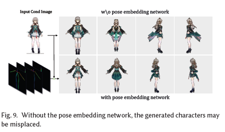 그림 9: 포즈 임베딩 네트워크가 없을 경우, 생성된 캐릭터가 잘못 배치될 수 있습니다.